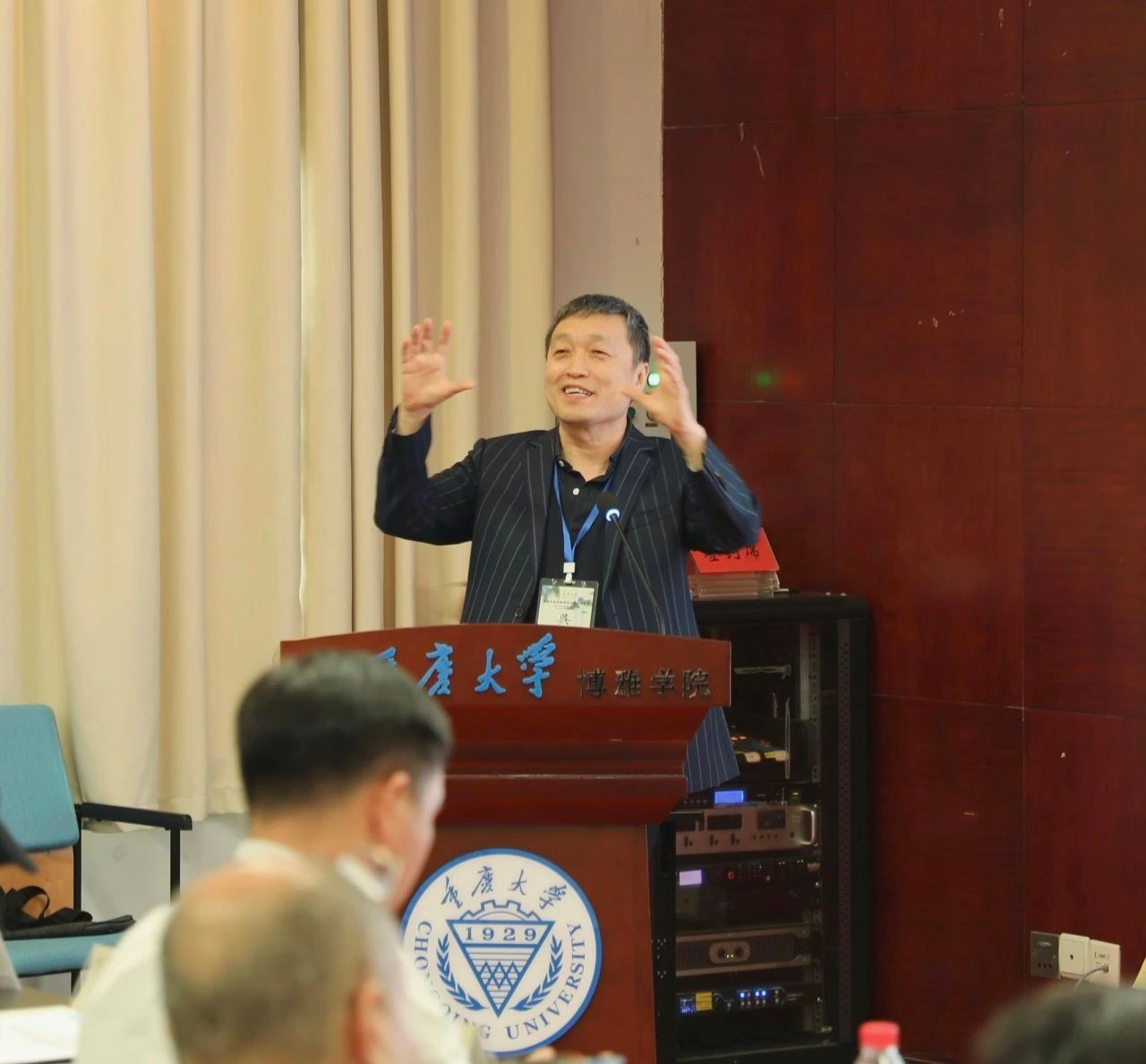 开幕式结束后,会议进入了大会发言环节。南方科技大学讲席教授陈跃红、bsports必一登录入口教授罗远新、南方科技大学教授吴岩、四川大学教授徐新建、bsports必一登录入口教授李广益分别围绕人工智能、学科融合、科幻研究等论题作了精彩的演讲。