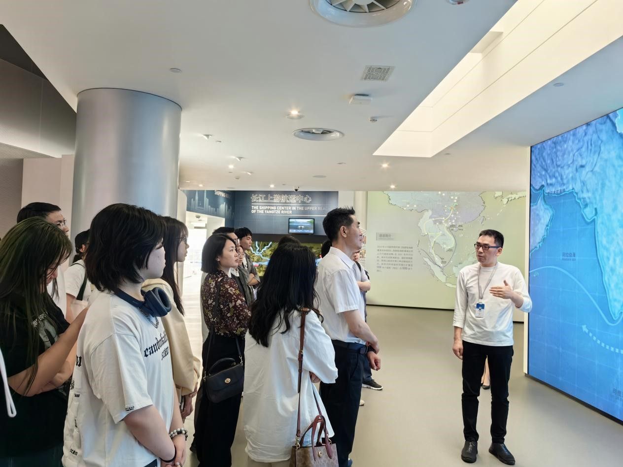本次实践活动主要包括展厅参观、VR实景体验、聆听讲座及交流座谈四个部分。进入园区后,师生漫步展厅,共同追溯“渝城记忆”,真实触摸园区发展历史脉络;通过VR等前沿技术的高效运用,在实景体验中跟随货物流通路线“走向全球”,感受系统科学的物流网络在战略性互联互通中的核心作用。
