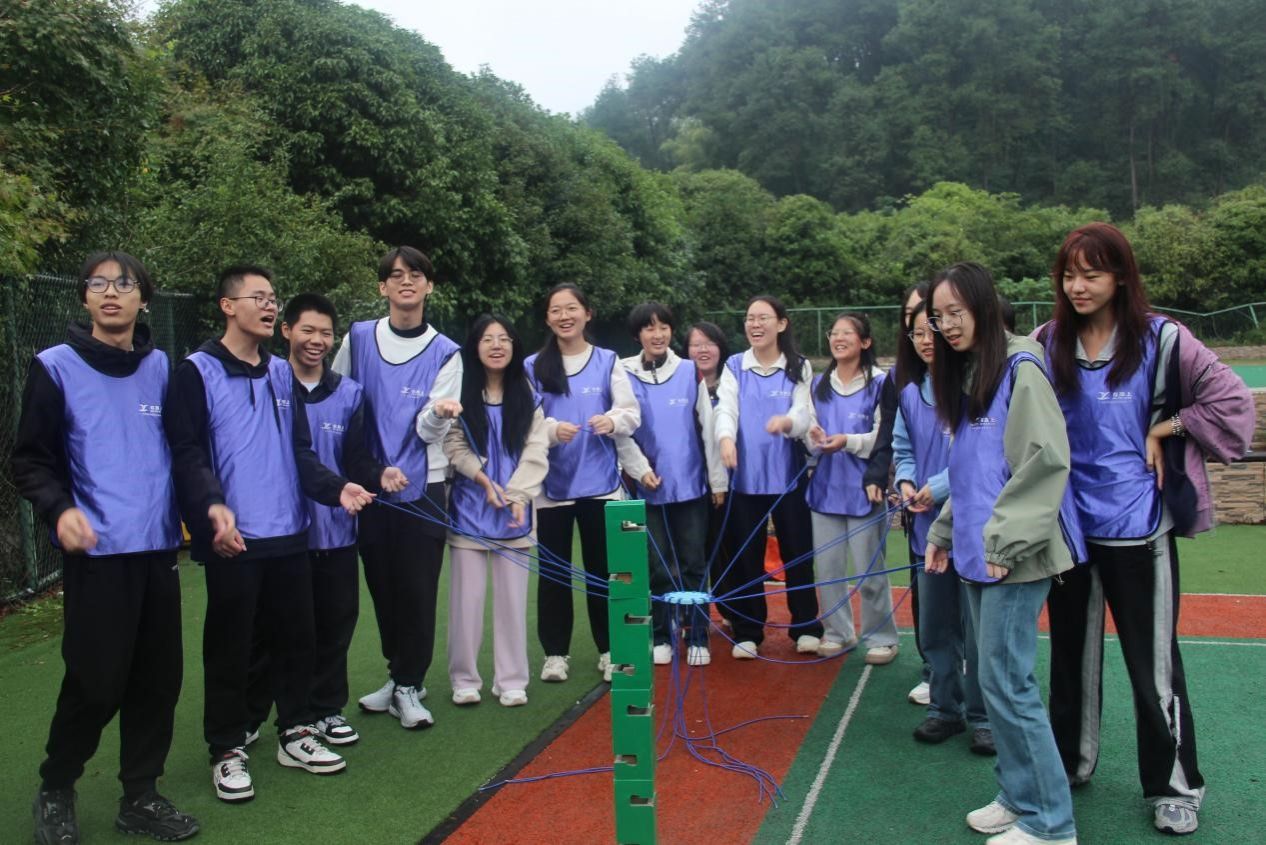 在此之后,紧接着开始了“建造大厦”的项目,同学们通过团队协作、共同操纵牵引绳,在限定时间内搭建了一座座稳固的“大厦”。整个活动场地中洋溢着同学们对彼此的声声鼓励、成功后兴高采烈的呐喊,整个场面朝气蓬勃、热闹非凡;“人椅”游戏则是考验同学们信任和协作能力的经典项目,大家围成一个圆圈,依次坐在后面同学的腿上,形成一个紧密的人椅。在教练的口令下,大家彼此互信、齐心协力,最终各组都成功完成了挑战;随后的游戏“信息驿站”则是一个信息传递的游戏,同学们通过无声的肢体语言,将信息从第一个人传递到最后一个人,从中体味和学习团队沟通的艺术。