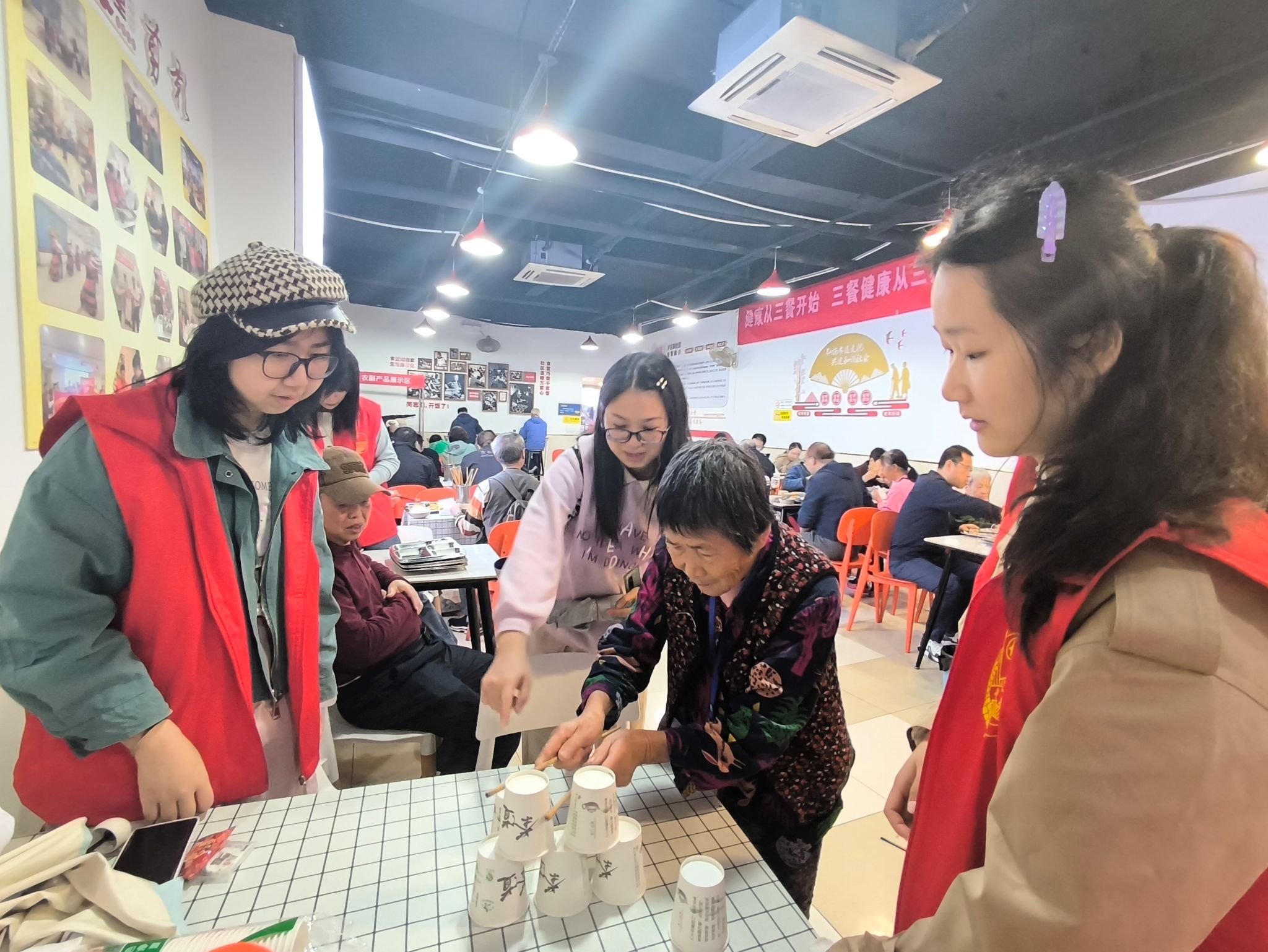 活动的整个流程紧密而富有趣味,志愿者们提前到达社区食堂,布置活动场地,为老人们提供舒适、干净、温馨的就餐环境。。活动现场,志愿者们细心地引领老人们入座就餐。为了增加活动的趣味性,志愿者们精心准备了魔术表演。奇妙的魔术表演让现场的老人们目不暇接,笑声不断,带来了浓厚的节日气氛。为了让老人们有更好的参与体验,志愿者们开展了叠叠杯趣味游戏。这项简单又充满趣味的游戏吸引了许多老人的积极参与。大家在轻松愉快的气氛中互动交流,享受着欢乐与游戏带来的乐趣。