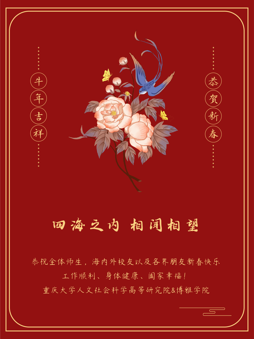 子鼠辞岁,金牛纳福。值此新春佳节来临之际,我们谨代表人文社会科学高等研究院&委、行政给您拜年啦!恭祝大家牛年吉祥、万事如意、阖家幸福!