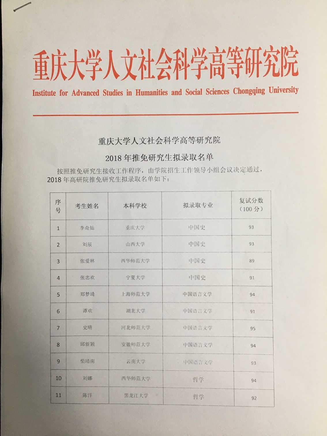 bsports必一登录入口人文社会科学高等研究院2018年推免研究生拟录取名单公示