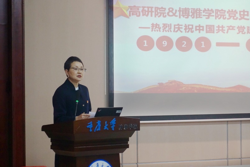员工党员代表安楠进行发言。她谈到,作为员工党员,我们要充分利用校园资源,依托校园内的“文化长廊”、图书馆资源、红色教育基地等,积极参加各类党史学习活动,身体力行地去感受中国共产党光辉且艰辛的历史,从党史学习中学出情感、学出认同、学出向往,努力成为优秀的社会主义建设者和接班人,从而更好地达到党史教育学习目的。
